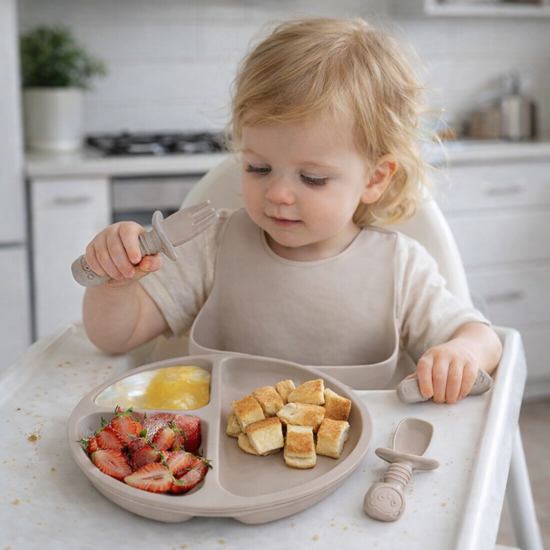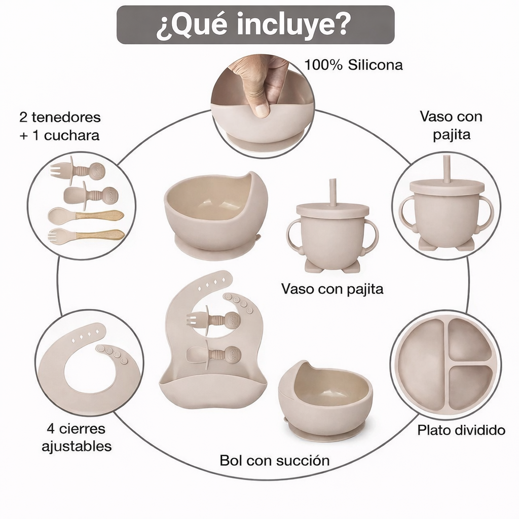 Hay muchos sets “bonitos”, pero no todos están pensados para que tu bebé aprenda a comer solo con menos derrames, más autonomía y materiales realmente seguros.